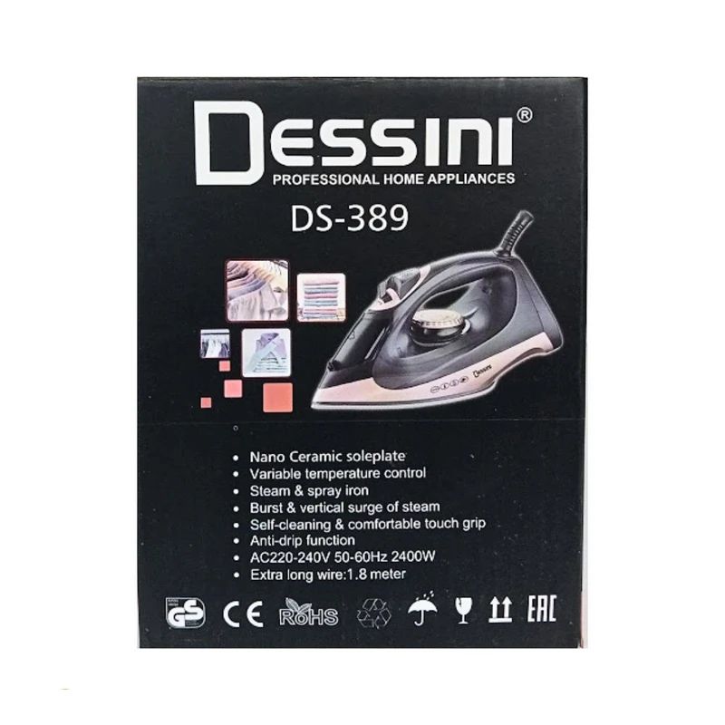اتو بخار دسینی مدل DS-389 یک دستگاه قدرتمند و باکیفیت است که با امکانات پیشرفته خود میتواند انواع پارچهها را بهخوبی اتوکشی کرده و چروکها را بهسرعت از بین ببرد. اتوبخار دسینی مدل ۳۸۹ یک اتوی حرفهای باکیفیت برای استفاده خانگی است. این اتو دارای کفی نانو سرامیکی است که در مقایسه با کفی چدنی و استیل کیفیت بالاتری دارد. اتو بخار دسینی مدل DS-389 دارای ولوم چرخشی تنظیم درجه حرارت، چراغ نشانگر روشن یا خاموش بودن، کلید تنظیم بخاردهی، سیستم ضدچکه، سلف کلین خودکار، بخار دهی عمودی، سیم چرخشی، قطع کن خودکار و اسپری پاشش آب است.